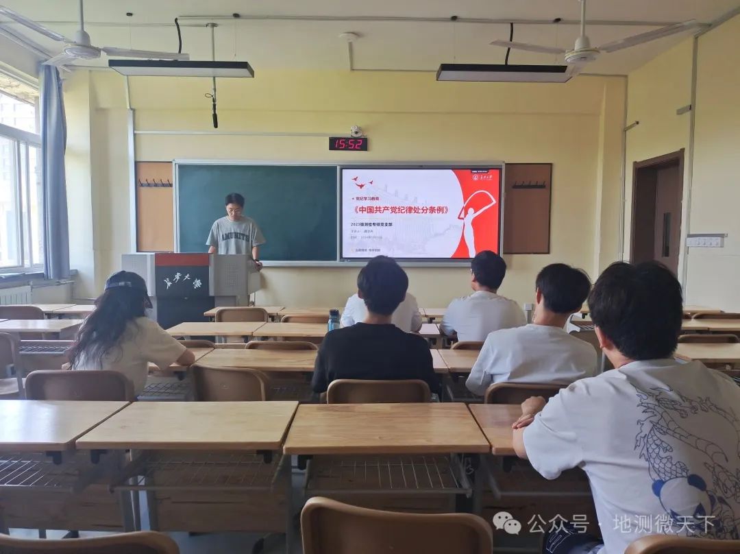 为深入学习《中国共产党纪律处分条例》,切实落实好习近平总书记在中国共产党第二十届中央纪律检查委员会第三次全体会议的重要讲话精神,2024年5月13日下午,2023级测绘专硕党支部于beat365官方网站楼406教室举行了《中国共产党纪律处分条例》党纪学习教育。学习会由龚浩冉同志主讲,全体支部党员参与。