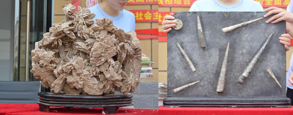 “沙漠玫瑰”(左)和“震旦角石”(右)
