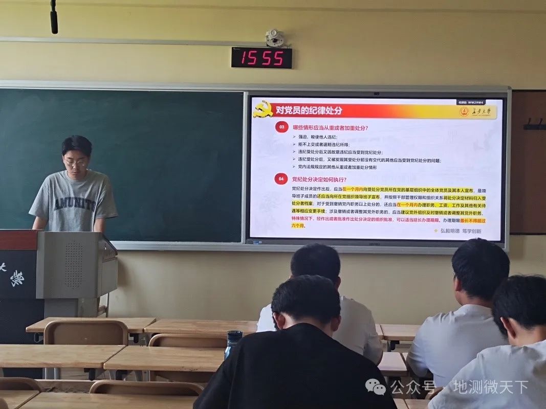 为深入学习《中国共产党纪律处分条例》,切实落实好习近平总书记在中国共产党第二十届中央纪律检查委员会第三次全体会议的重要讲话精神,2024年5月13日下午,2023级测绘专硕党支部于beat365官方网站楼406教室举行了《中国共产党纪律处分条例》党纪学习教育。学习会由龚浩冉同志主讲,全体支部党员参与。