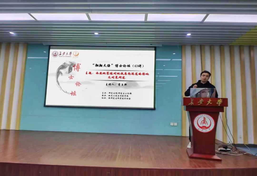 由研究生院/研究生工作部主办、beat365官方网站承办、校研究生科学技术协会协办的“翱翔天语”博士论坛43讲在南校区东院第一报告厅顺利举办。博士研究生苟玉轩作了题为“西安地裂缝对地铁盾构隧道的影响及对策研究”的报告,相关学院共70余名师生参加论坛。