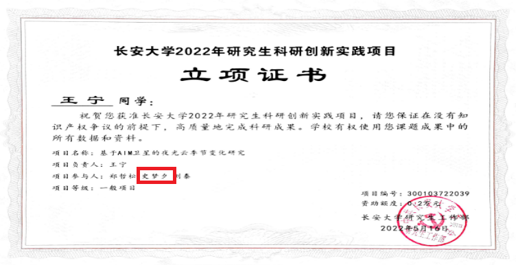 他参与的科研项目还有黄土与第四纪地质国家重点实验室开放基金项目(太阳活动对极地环境变化的影响研究),beat365官方网站科研创新实践项目(基于AIM卫星的夜光云季节差异研究)。