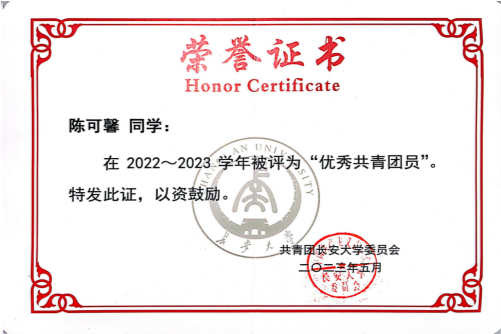 “优秀共青团员”证书