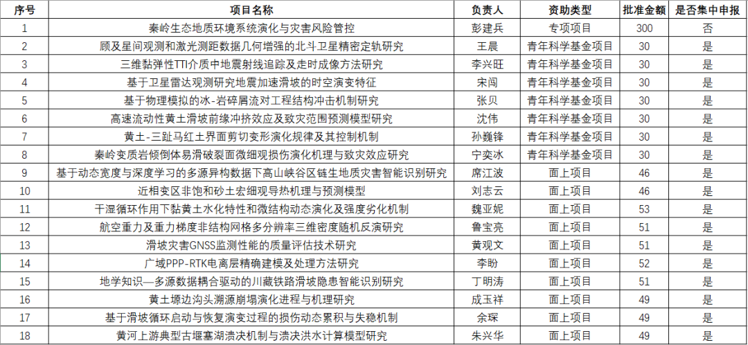 近日,国家自然科学基金委公布了2023年度国家自然科学基金项目评审结果。在学院教职工的共同努力下,beat365官网2023年度国家自然科学基金项目共获批18项,彭建兵院士获批重点专项项目1项,集中获批面上项目10项,青年基金项目7项,资助项目经费总额1007万元。