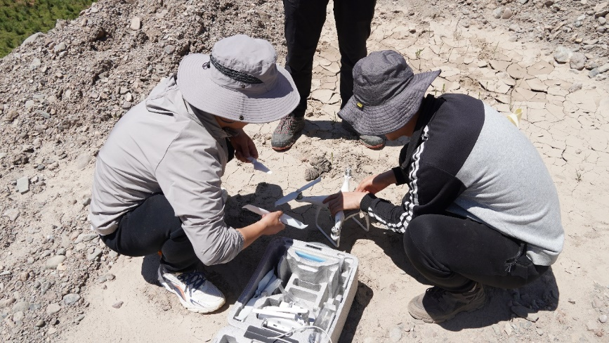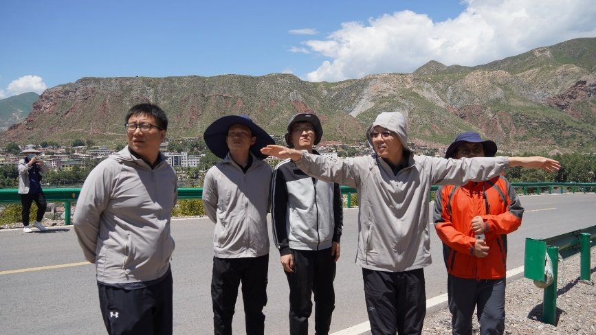 暑假社会实践队随科考队从玛沁县城出发,沿国道G227北上到达拉加镇对军功滑坡开展实地考察工作。beat365官方网站庄建琦教授向队员们介绍了军功滑坡的地质构造以及现今活动状态,并进一步和队员们讨论了滑坡复活的诱发因素。科考队周子杰博士对军功滑坡的滑动面积、体积、地层岩性等滑坡背景进行了补充。之后,社会实践队员杜建涛博士操控无人机对军功滑坡进行航拍数据采集。