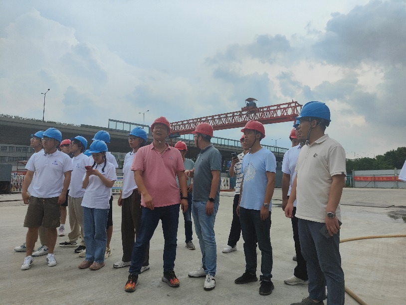 在项目介绍结束后,石经理、边副经理和汪总工带领实践队员来到施工现场,向同学们展示了顶管法所用的钻头,观摩了现场正在进行施工的顶管工作现场。