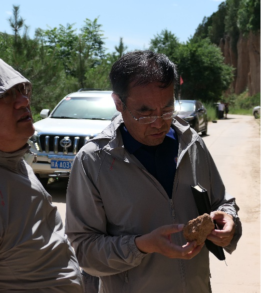 李永军教授结合现场观察到的节理构造发育情况以及地质构造图,向队员们讲解了河流流向与断层之间的联系,大家就黄河流向以及多次改道情况与李永军教授展开深入讨论。实践队队员刘银鹏携带地质锤对红土林进行了采样,李永军教授现场判读和讲解。