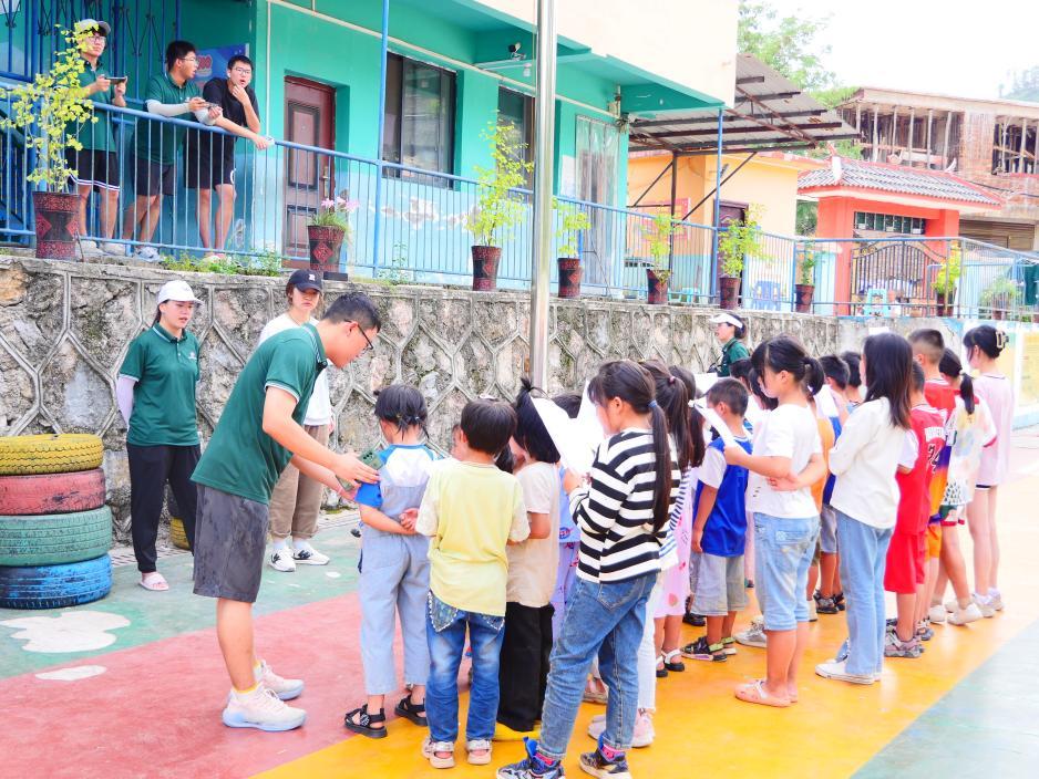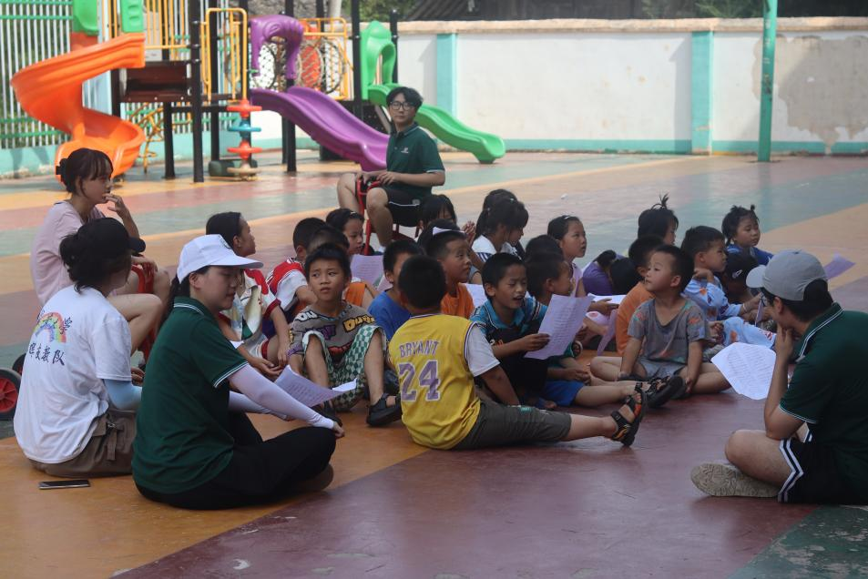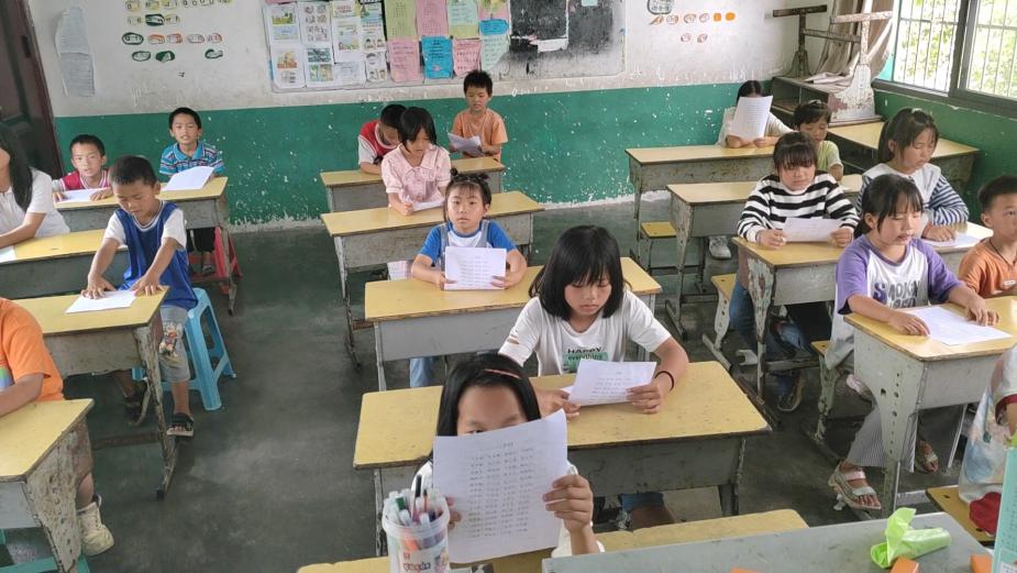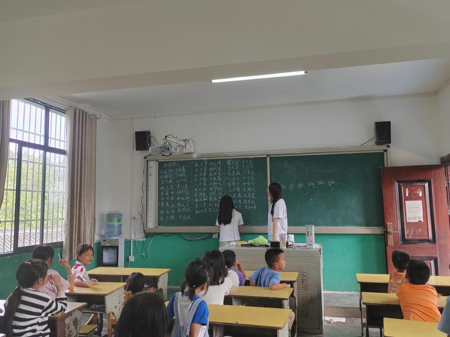 在跟读过程中,实践队员发现孩子们在细节字词的发音上出现不少问题,尤其分不清平翘舌音和鼻音边音。实践队员一句句带读,并将重点字词的拼音在黑板上标记出来,以纠正关键字词、易错字词发音,力求为孩子们纠正不标准发音,打好普通话基础。