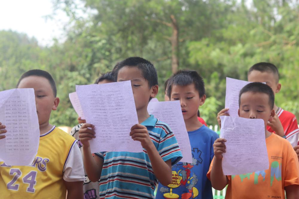 南江小学学生以一、二年级为主,在校人数不足二十人,学生普通话规范程度普遍不高。因此,根据学生的年龄分布,实践队员提前制定了教学方案,确定将《三字经》和《弟子规》作为主要诵读内容,朗朗上口且具教育意义。另外,实践队员推荐经典名篇,讲述传统故事,开展了诗歌朗诵、普通话比赛等活动,与孩子们学唱了歌曲《送别》《国家》以及《共产主义接班人》。通过诵读爱国诗歌、名家名篇引导儿童热爱中华文化、增强文化自信、培养爱国情怀,在寓教于乐中引导农村少年儿童阅读中华传统经典、红色经典和当代经典阅读,在阅读中增强热爱中华文化的自觉、增强文化自信,铸牢中华民族共同体意识。