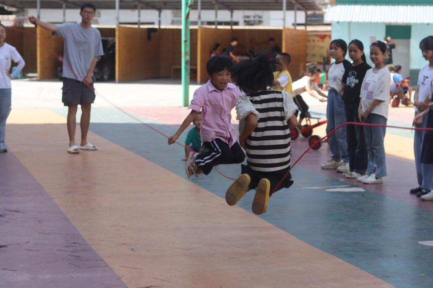 比赛一共分为四项,分别是跳大绳、骑车接力赛、接力跑和抢气球比赛。孩子们两人或三人一组,相互配合,全力参与,每一声呼喊都展现出孩子们拼搏奋斗和团结协作的精神风貌。