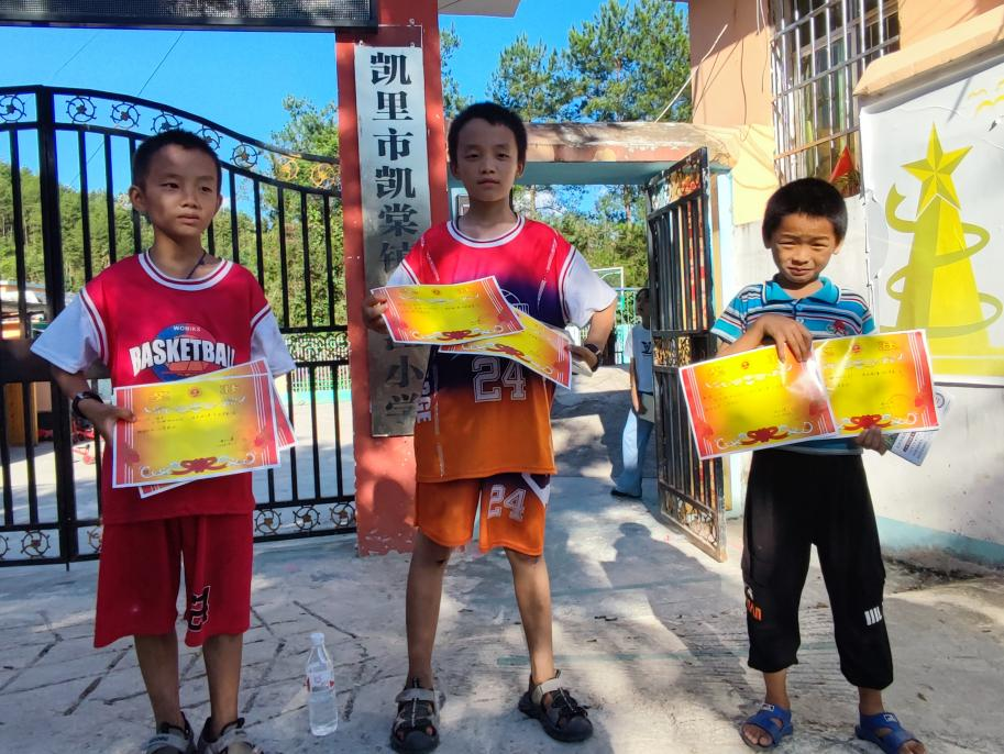 趣味运动会结束,实践队员给各项比赛前三名学生颁发了奖状和奖品。