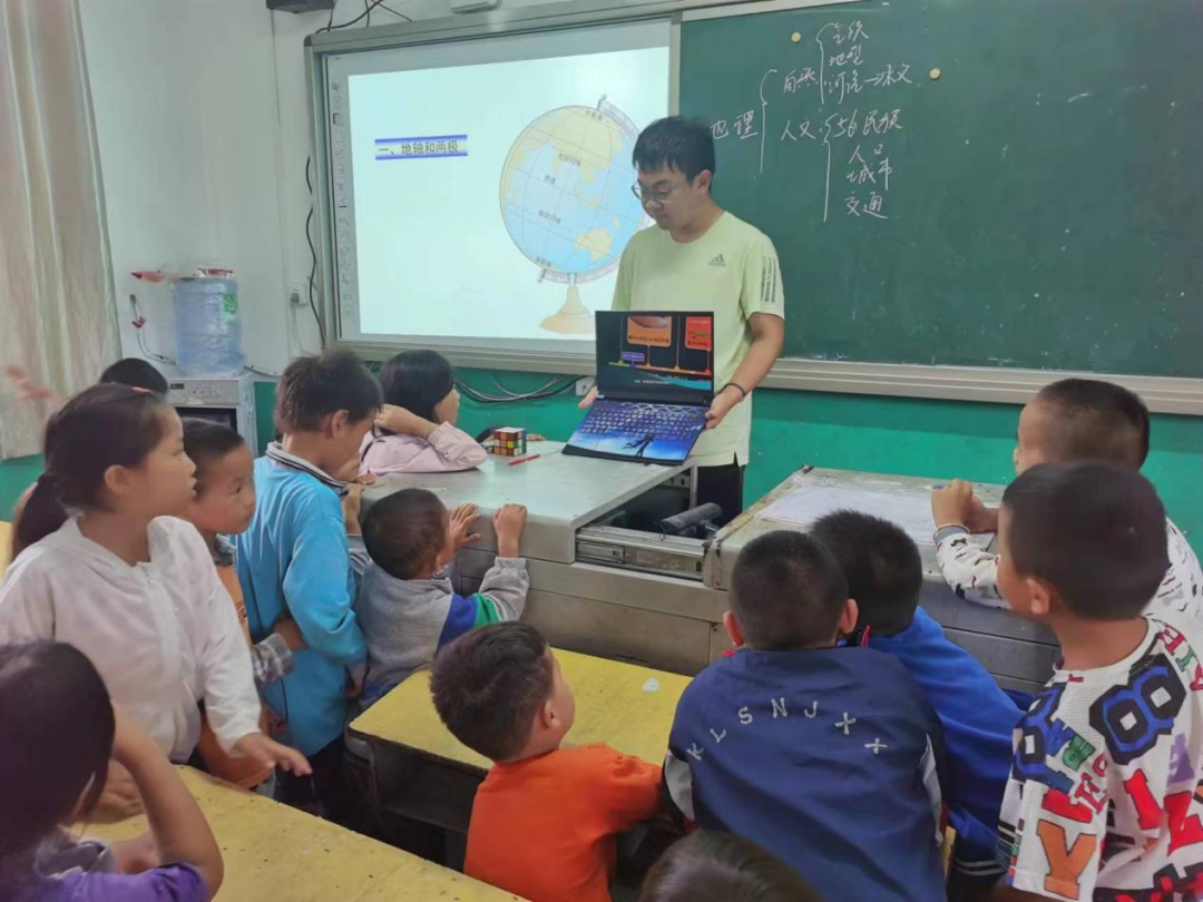 谈自然地理,悟山川之美。在课堂的一开始,实践队员向学生们展示了一张世界地图,并引导他们观察和思考各个国家的地理位置、地形地貌以及人口分布等特点。通过讨论和分享,学生们对世界各地的自然景观和人文历史产生了浓厚的兴趣。接着实践队员向孩子们展示了一系列与地理相关的图片和视频资料。学生们目睹了壮丽的山川、蜿蜒的河流、奇特的地貌以及丰富的自然资源。同时,实践队员还结合实例,向学生们讲解了气候变化、环境保护、自然资源利用等与地理息息相关的议题。这堂生动的地理课不仅大大拓宽了孩子们的视野,增长了知识,还激发了对地理学科的热爱和探索欲望。