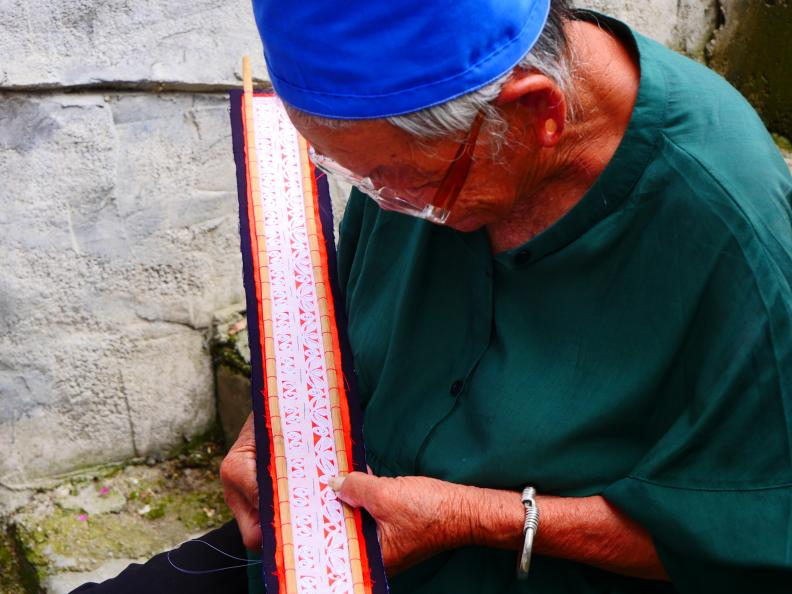 在访谈之后,团队成员在顾书记带领下进入梅香村苗绣产业基地进行参观,一件件不同的苗绣产品承载着人们对幸福美好生活的期盼与祝福。在参观过程中,顾书记讲道:梅香村的苗绣主要以打籽绣为主,打籽绣是中国刺绣传统针法之一。主要运用于苏绣,是点绣的一种,亦称打籽。用线条绕成粒状小圈,绣一针,形成一粒“子”,故名。同时,团队走访了多位苗绣娘,认真学习苗绣的技法,仔细聆听了苗绣娘的讲解,使得每位团队成员对苗绣技法有了基础性的了解。苗绣,这门古老的手艺,在一代一代苗族女人的手中传递。在苗乡,每个女人都是苗绣的能手。这是一个用五彩丝线编织神话的民族。苗族女人用刺绣编织着自己民族最深刻的历史记忆,用刺绣编织着对生命的敬畏与热爱,用刺绣编织着对美好生活的最高梦想。苗绣的一针一线,更是蕴含着苗族人民的世界观、价值观和审美观,是苗族文化的重要载体。