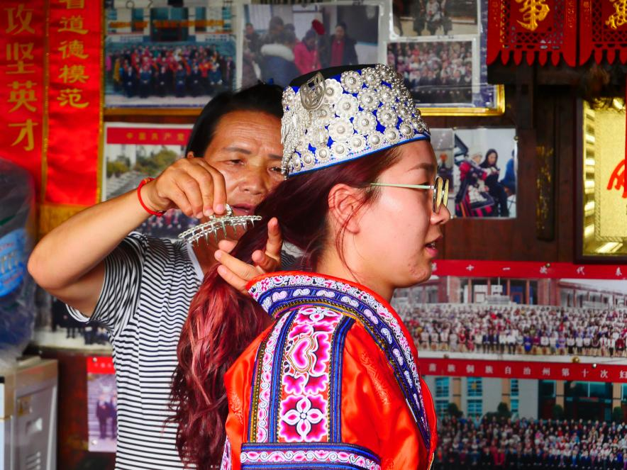 为使团队成员更好地了解学习苗绣文化知识,顾书记带领团队进入到自己家中,主动让团队成员试穿苗族服饰,真正使得团队成员亲身感受苗族服饰的魅力特色。
