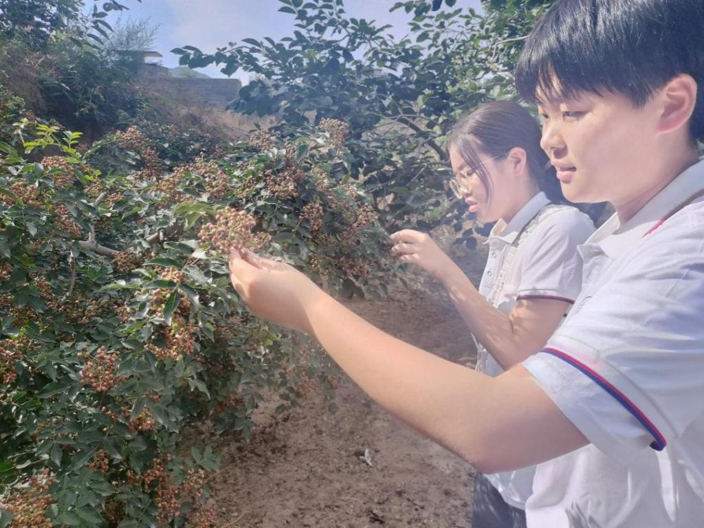 图为实践队员在园区负责人带领下了解花椒的生长情况
