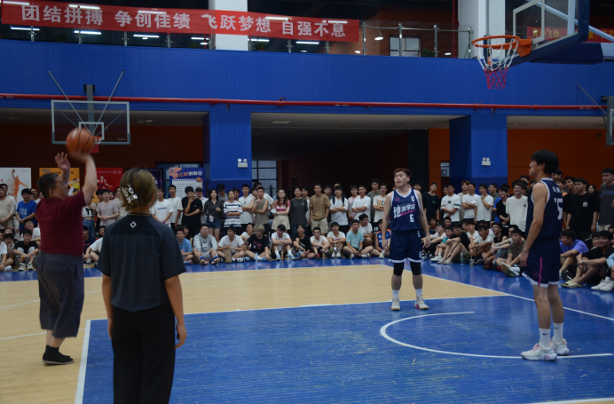 比赛上半场结束,beat365官方网站党委书记戴宏在中场休息期间走进球场投篮,一个接一个的进球引起全场观众的欢呼,场馆内的气氛也在戴宏书记的一个个进球中变得更加热烈。