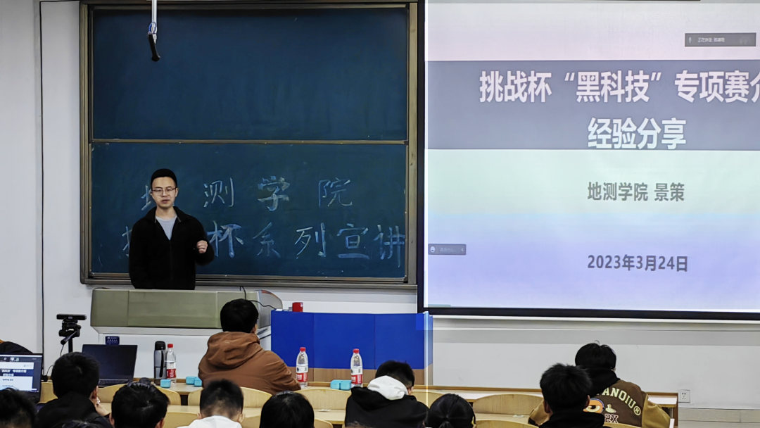 宣讲人景策则以“黑科技”专项赛事解读为主向同学们分享经验,强调“新”是“黑科技”赛事最重要的特点。在分享过程中,他细致地讲述了如何阐述问题、凝练背景紧跟时事、技术路线要耳目一新三个方面的问题,并提醒同学们提交作品的形式应以实物为先、提交图文和视频作品。最后,景策还提到大一新生们富有想象力能够提出新想法、大二大三学长富有各类赛事经验,二者的结合往往能发挥出最大效果,鼓励同学们积极寻找学长合作,踊跃参与到比赛中来。