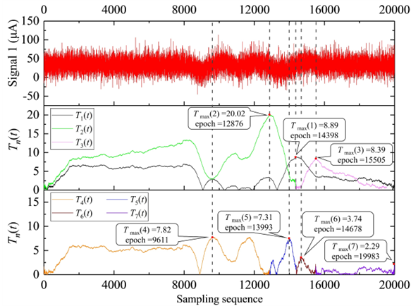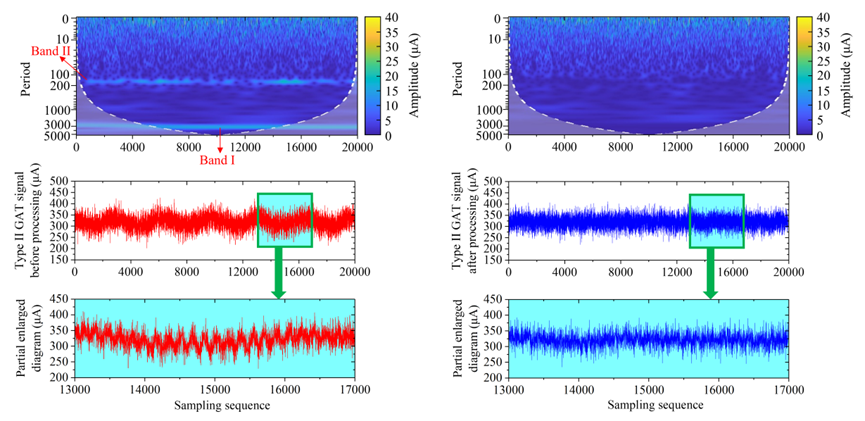 依托GAT磁悬浮陀螺全站仪的连续模数信息转换和模拟仿真技术,杨志强教授团队的博士生王逸文等首次系统性研究了磁悬浮陀螺力矩器转子的周期误差特征,提出了一种基于连续小波变换和奇异谱分析的磁悬浮陀螺转子电流信号的自适应周期误差探测与分离模型(图1),提高了仪器的寻北精度,进一步揭示了陀螺转子运动的物理机制。
