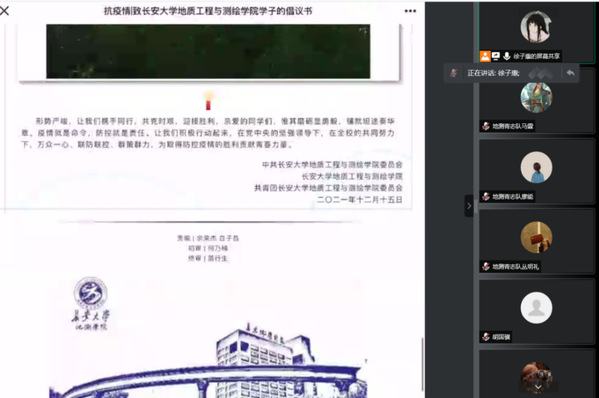 其次,各位学长学姐也细致地与各位同学沟通交流,从吃穿住等多方面进行关心,告诉各位同学要学会控制情绪,自我调整,同时对同学们反映的学习、生活问题进行了采集和记录,在疫情防控的艰难期间,让同学们感受到了学长学姐的温暖与关怀。最后,大家一起学习《致beat365官方网站学子的一封信》,并观看相关抗疫视频。