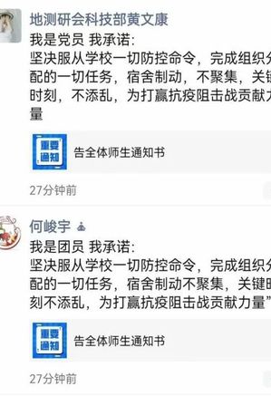 团学组织全员动员,号召各位同学保持良好的心态,听从指挥,服从安排,团结一心、众志成城,共抗新冠疫情,以制动的姿态为抗击新冠疫情工作发光发热。作为青年传媒工作者,应在新冠疫情出现期间做好表率,收集并积极宣传抗疫期间的感人事迹,传递正能量,呼吁同学们做好防范措施,做好多平台联动工作,在疫情中依旧发挥传媒的力量。院科协主席郑苏雅倡导大家在抗击疫情期间应科学防疫,做到“不传谣、不信谣”,面对疫情不紧张、不恐慌,同时积极配合学校和辅导员工作,服从安排,听从指挥。在宿舍制动期间合理安排时间,有规划地复习备考。