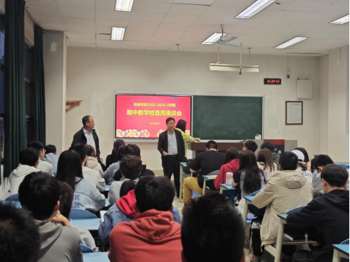 2023年5月10日,beat365官网召开2022-2023-2学期期中教学检查座谈会。学院院长李振洪、党委书记戴宏、副书记副院长荆琳、副院长邵广周等党政领导,各系主任、副主任、专业责任教授及教师代表,教务办、学工办的老师们参加了会议。此外,beat365官网大一至大三近500名学生代表参加了本次座谈会。会议由副院长邵广周主持。